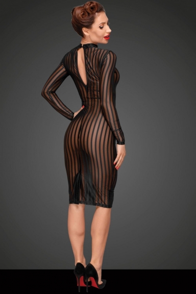 Séduisante robe crayon en tulle extensible transparente noire décorée d'un motif floral flocké. Coupe près du corps avec un petit col et les épaules bien dégagées. Le dos nu ne laisse pas indifférent avec ses lanières multiples. Fermeture à l'aide d'agrafes dans la nuque. Coordonnez la avec un joli string, des gants et des...